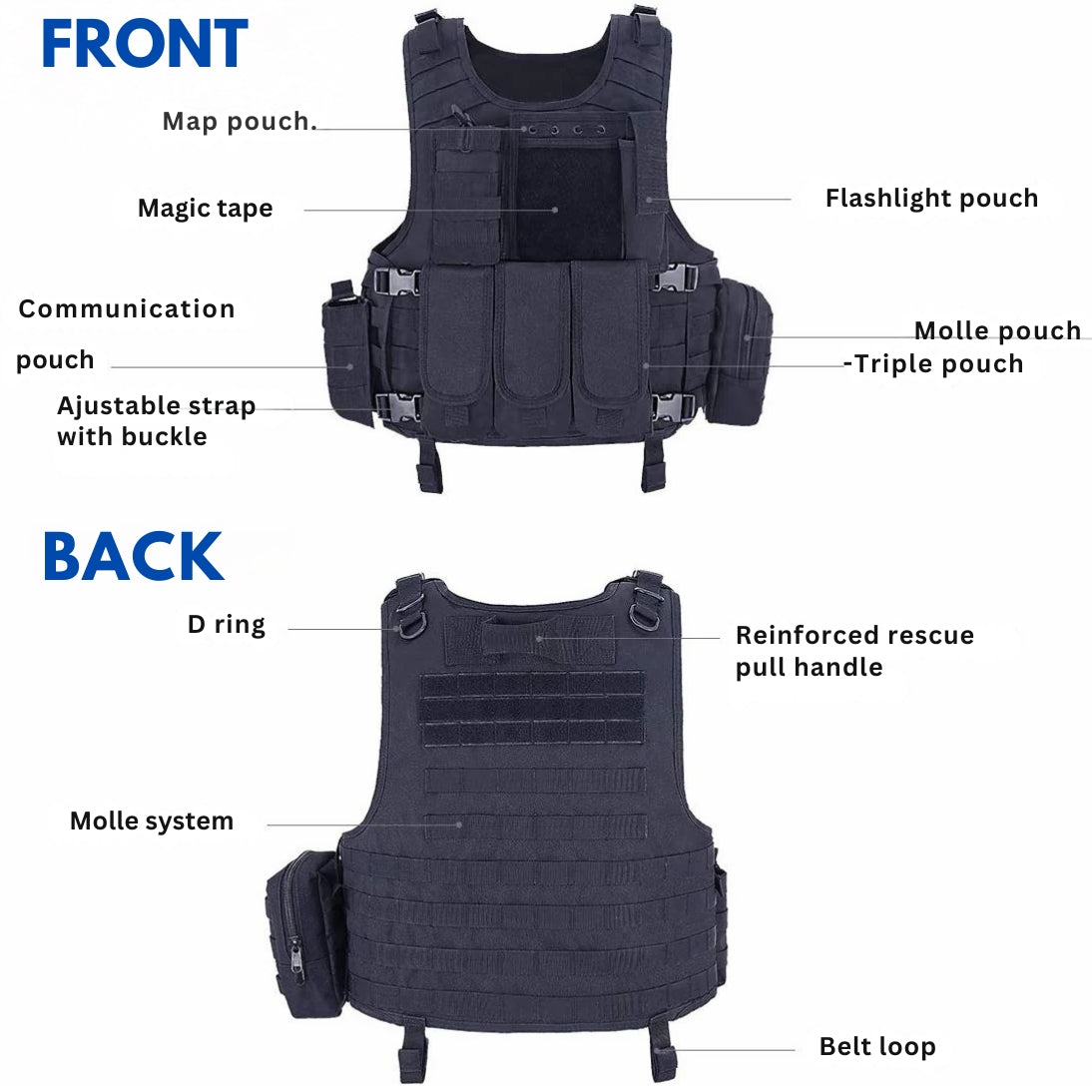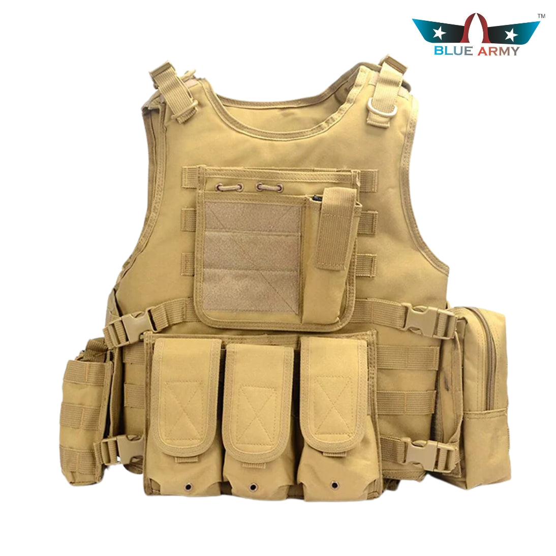 Designed for maximum utility and comfort, the Blue Army Tactical Vest keeps your essential gear easily accessible. With adjustable sizing for a custom fit, this vest features padded, non-slip shoulder straps and reinforced belt loops to ensure it stays in place during any mission. Offering multiple storage options, the vest is made from durable, breathable nylon mesh for comfort in any environment. Quick-release side buckles allow for easy on-and-off, keeping you ready for action at a moment’s notice.